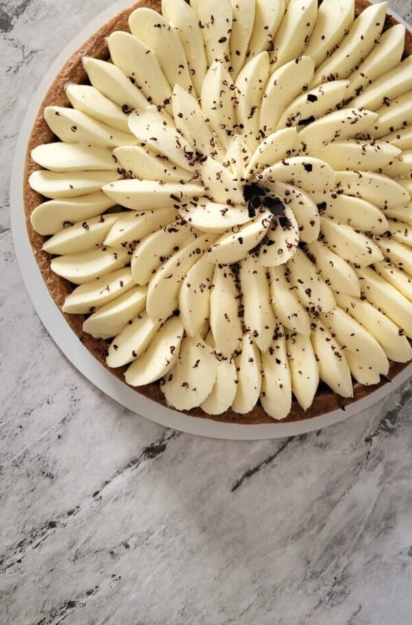 Base de sablee de vainilla, dulce de leche, banana, chantilly. Chocolate rallado para decorar